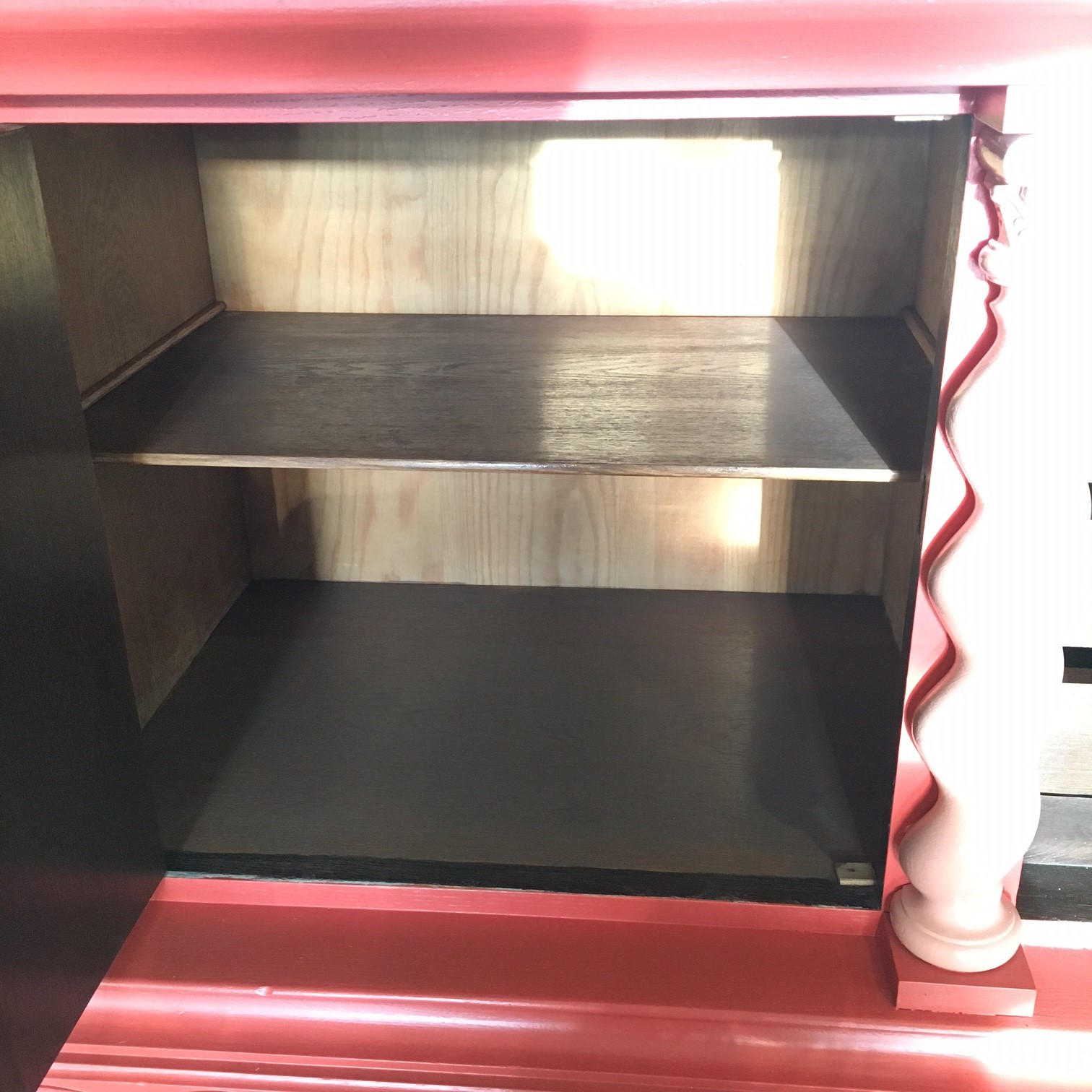 Sjenken er i massiv eik, og dønn solid. Men hadde litt skjolder på topplaten, men ingen hakk i lakken. Så da slapp jeg pussingen, bare vasket over med en kraftvask for å få vekk gammel skitt.